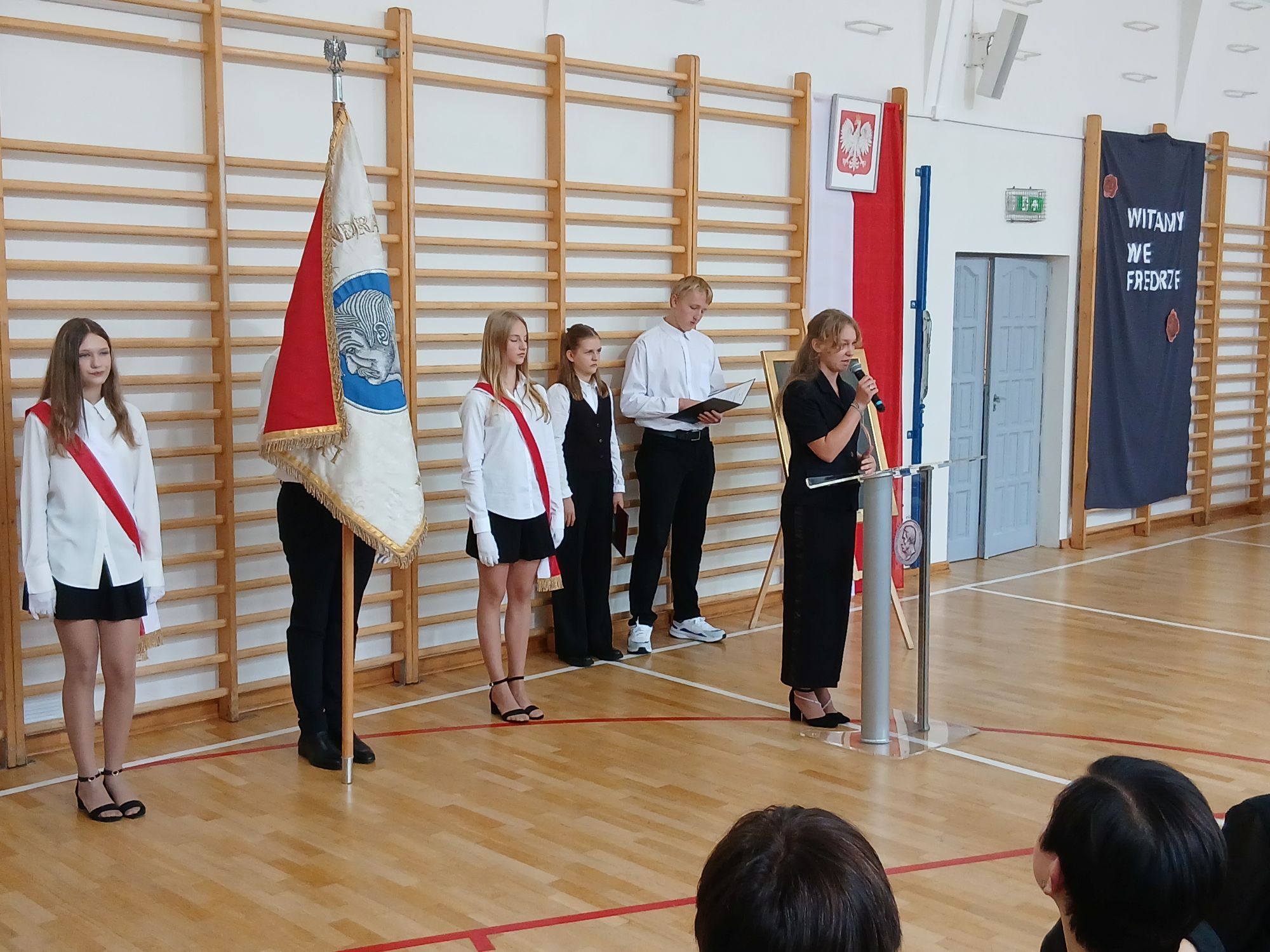 Słowa powitania skierowała do Pierwszoklasistów również Anna Grzelak, przewodnicząca Samorządu Uczniowskiego, zapewmniając o otwartości fredrowskiej wspólnoty i zachęcając do angażowania się w uczniowskie inicjatywy.