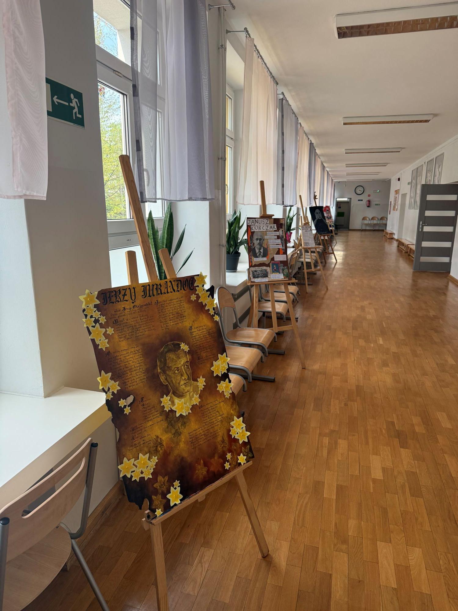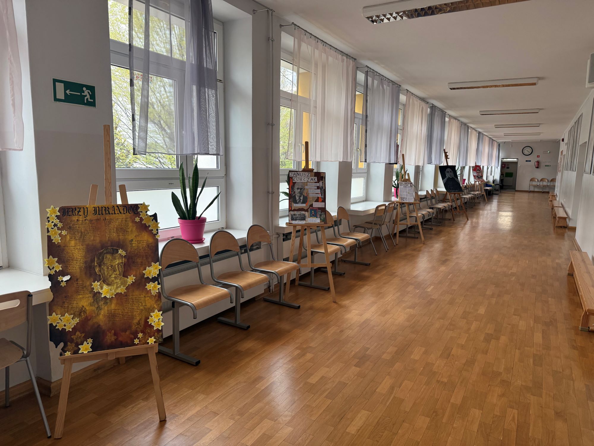 Z kolei na szkolnym korytarzu uczniowie mieli możliwość obejrzenia wystawy plakatów przedstawiających sylwetki artystów z getta warszawskiego, które zostały stworzone przez uczniów z klas 1-3.