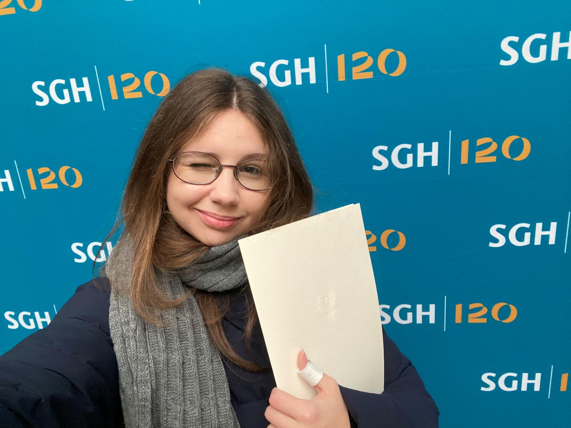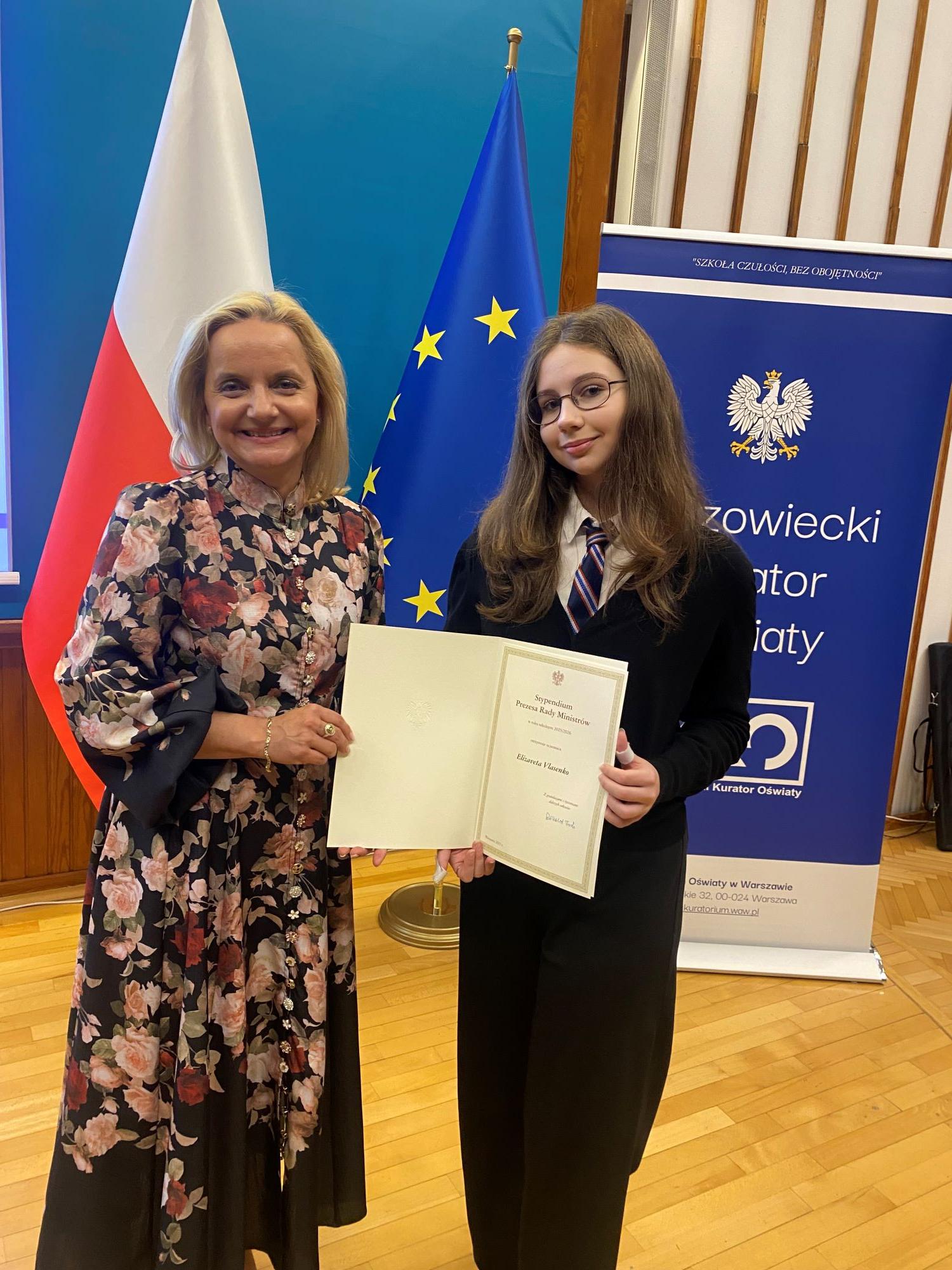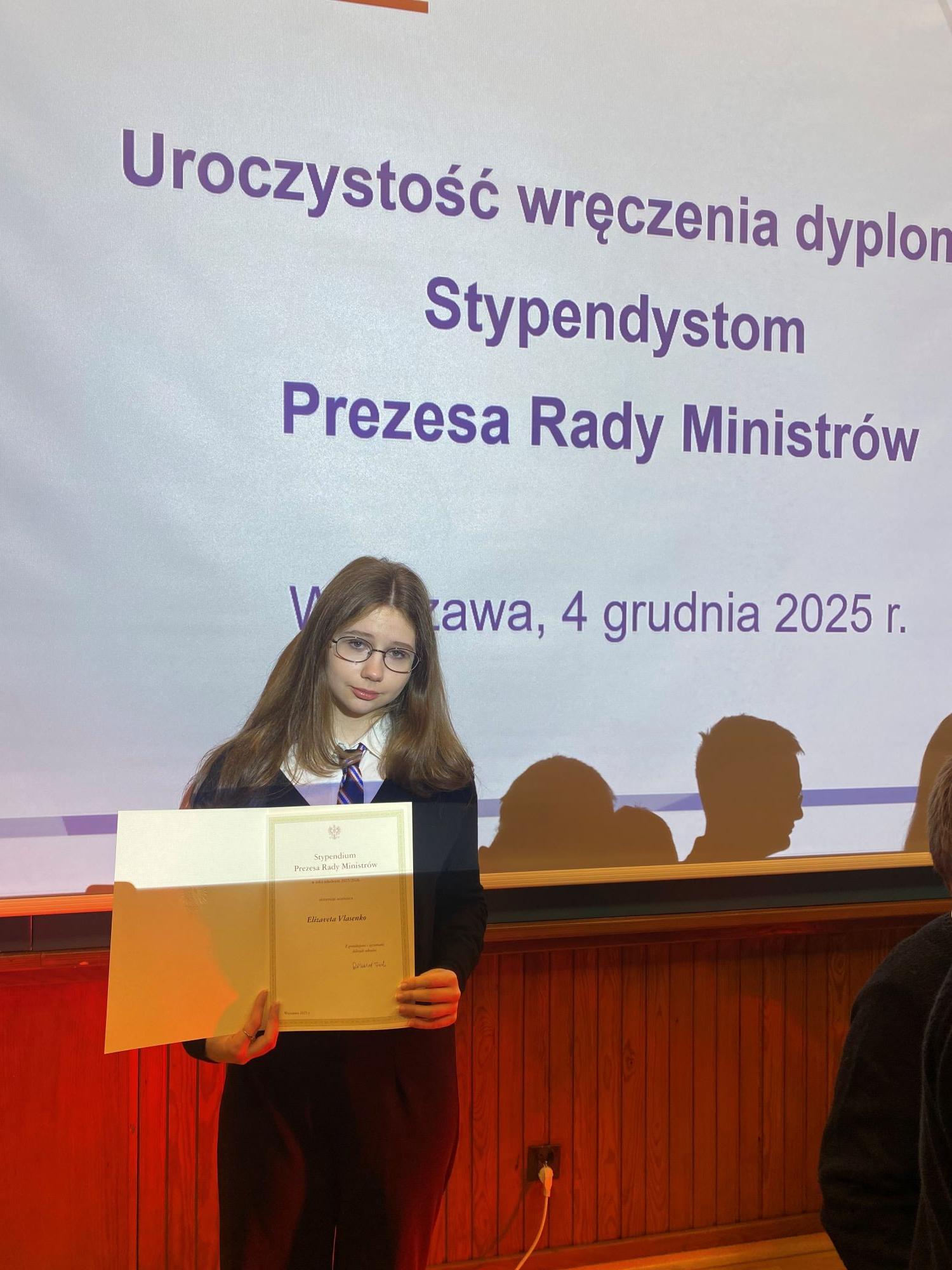 W czwartek 4 grudnia w siedzibie SGH w Warszawie miała miejsce uroczystość wręczenia Stypendiów Prezesa Rady Ministrów. Przypominamy, że stypendium to przypada w udziale każdemu najlepszemu uczniowi danej szkoły. Do stypendium Premiera rekomendacji udziela Samorząd Uczniowski, a najlepszy uczczej to uczeń z najwyższą średnią ocen w minionym roku szkolnym lub z innymi osiągnięciami na gruncie naukowym. Stypendystką z LXXXI LO za rok szkolny 2024/2025 została Elizaveta Vlasenko z obecnej klasy III E. Na uroczystej gali Elizaveta otrzymała pamiątkowy dyplom od przedstawicieli władz państwowych z Kancelarii Premiera i z Kuratorium Oświaty w Warszawie.